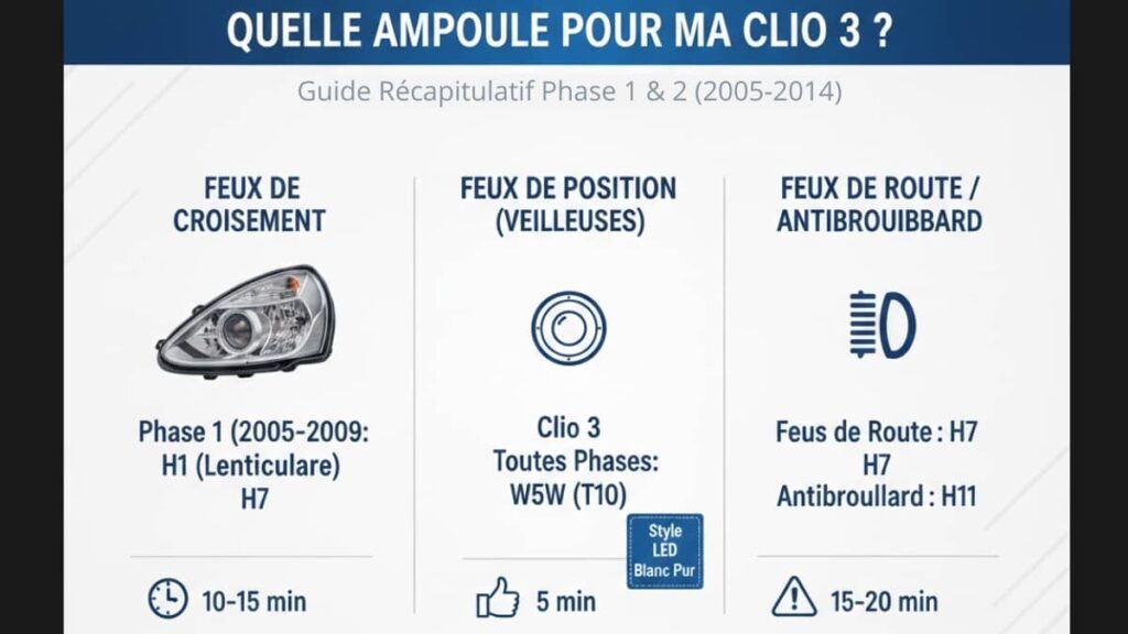 📋 Tableau Récapitulatif : Quelle Ampoule pour Votre Clio 3 ?